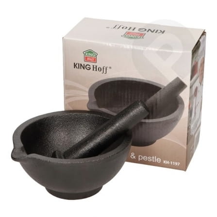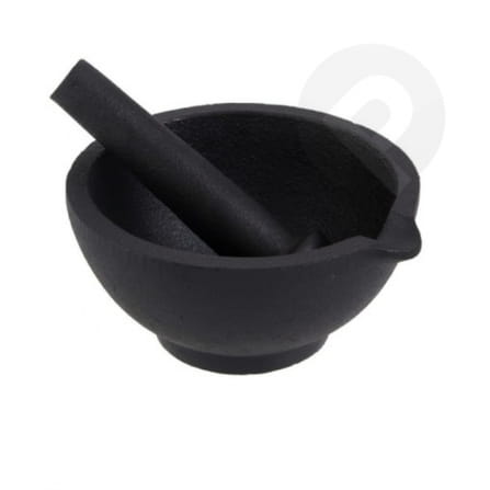 Możdzierz i ubijak w zestawie z jednorodnego odlewu żeliwa wraz z tłuczkiem.