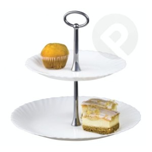 2-poziomowa patera wykonany jest ze szkła, dzięki czemu jest niezwykle wytrzymała. Szkło jest materiałem nieporowatym, dlatego nie zatrzymuje żadnych mikroorganizmów, jest 100% higieniczne. Ma nowoczesny i estetyczny wygląd. Doskonale pozwoli w stylowy sposób zaserwować ciasta, torty, owoce i inne słodkie wypieki prosto na stół. Patera posiada uchwyt, który ułatwia jej przenoszenie.