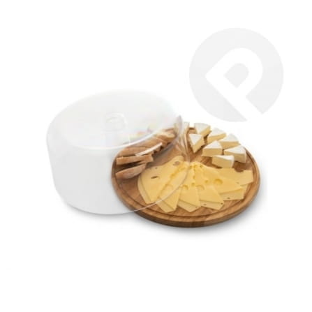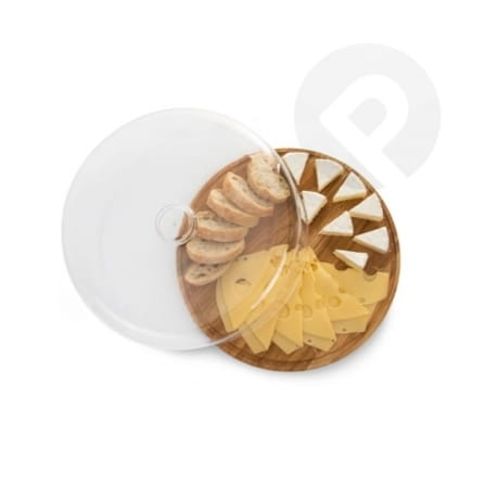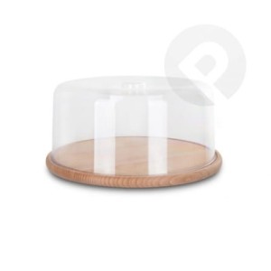 Patera z drewnianą podstawką i kloszem z tworzywa sztucznego.