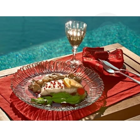 Talerz okrągły wykonany jest z bezbarwnego szkła hartowanego, dzięki czemu jest niezwykle wytrzymały. Niezwykle oryginalny kształt naczynia przypomina kwiat z widocznymi płatkami Szkło jest materiałem nieporowatym, dlatego nie zatrzymuje żadnych mikroorganizmów, jest 100% higieniczne. Idealnie nadaje się do serwowania mięs, warzyw, owoców, sałatek, frytek, przekąsek czy ryb w galarecie.