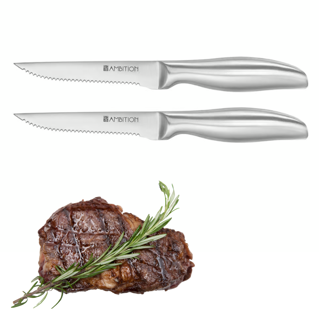 ? Komplet: Zestaw zawiera 2 noże do steków, idealne do serwowania i krojenia mięsa.