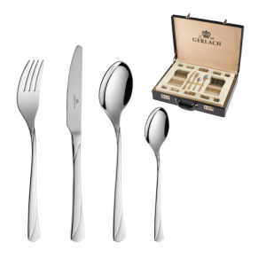 Elegancki zestaw sztućców GERLACH VALOR 68 el. to połączenie klasyki z subtelnym zdobieniem. Wykonany z wysokiej jakości stali nierdzewnej 18/10, idealny do codziennych posiłków oraz specjalnych okazji. Zestaw zapakowany w praktyczną walizkę, idealny na prezent.