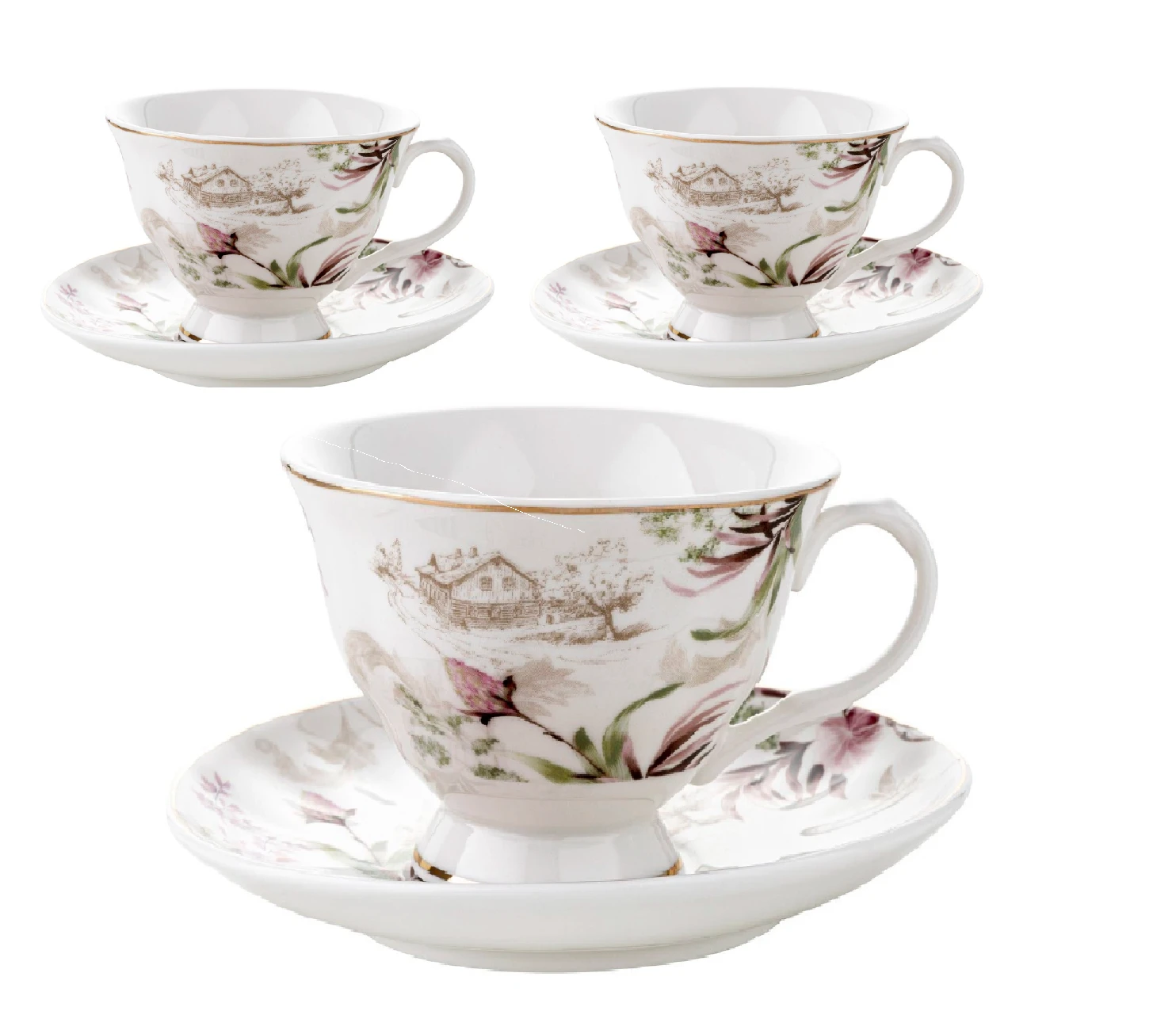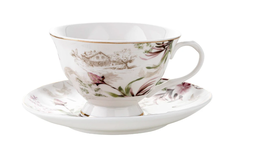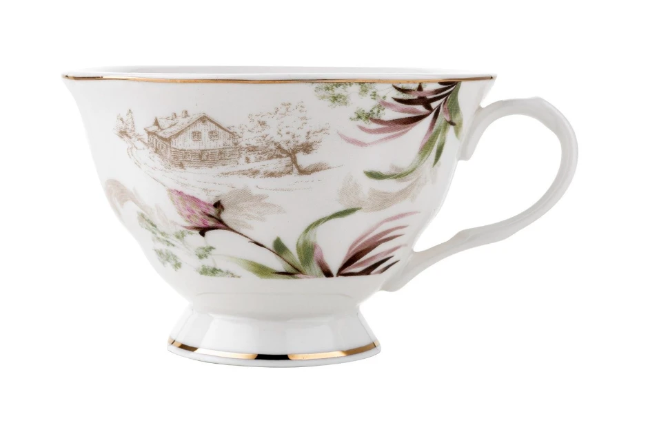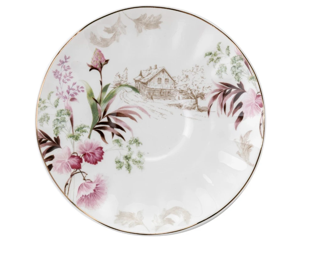✴️Sielski motyw wiejskiego domu Spomiędzy kwiatowych dekoracji wyłania się subtelny rysunek wiejskiego domu widzianego z sadu, nadając filiżankom wyjątkowego uroku i nostalgicznego klimatu.