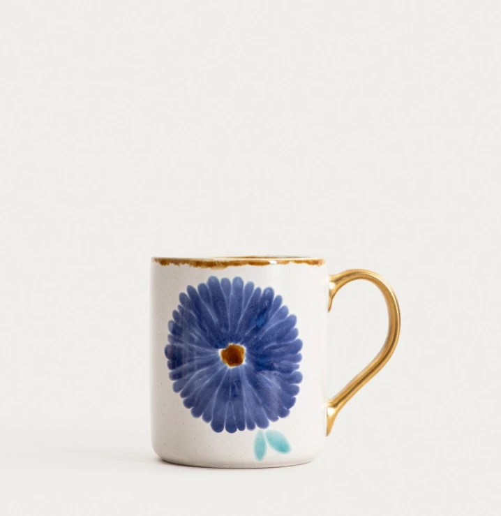 Kubek MEREN o pojemności 0,5 l to wyjątkowe naczynie, które łączy funkcjonalność z eleganckim wzornictwem. Subtelny motyw niebieskiego kwiatu oraz efektowne złote ucho nadają mu wyjątkowego charakteru, dzięki czemu doskonale sprawdzi się zarówno na co dzień, jak i podczas wyjątkowych chwil przy ulubionym napoju.