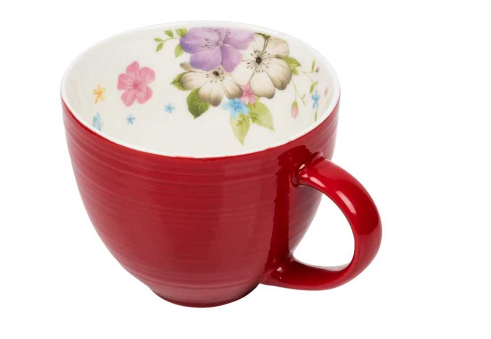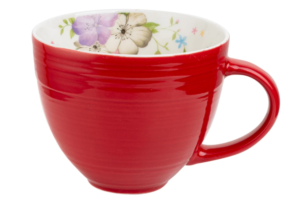 Kubek porcelanowy o pojemności 450 ml to wyjątkowe połączenie funkcjonalności i stylowego wzornictwa. Intensywny czerwony kolor na zewnątrz oraz subtelny kwiatowy motyw wewnątrz sprawiają, że naczynie przyciąga wzrok i pięknie prezentuje się w każdej kuchni.