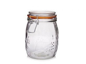 Elegancki i praktyczny okrągły słoik szklany z metalową klamrą i uszczelką to doskonały wybór do przechowywania domowych przetworów, miodu, przypraw oraz sypkich produktów. Wykonany z przezroczystego szkła, jest ozdobiony subtelnymi wybrzuszeniami w kształcie owoców, co nadaje mu wyjątkowego uroku. Metalowa klamra i silikonowa uszczelka gwarantują szczelność, chroniąc zawartość przed wilgocią i utratą świeżości.