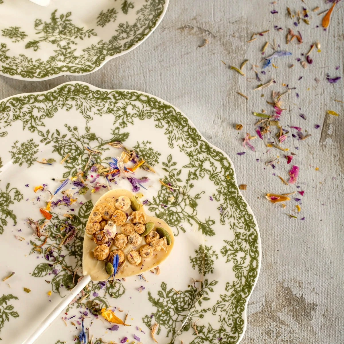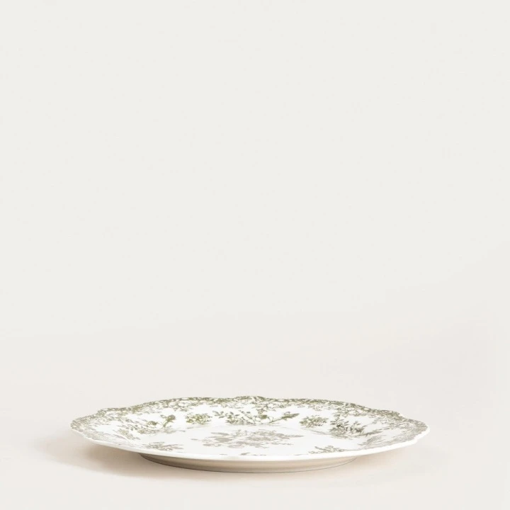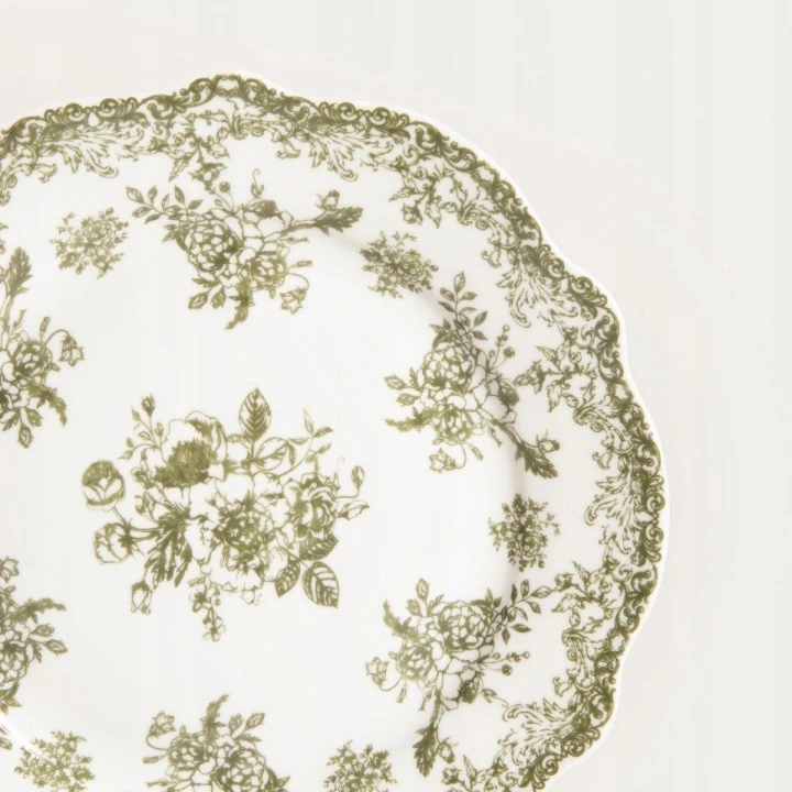 ✴️Kwiatowy wzór Powierzchnię naczynia zdobi subtelny zielony motyw kwiatowy na białym tle, nadający talerzowi świeży i dekoracyjny charakter.