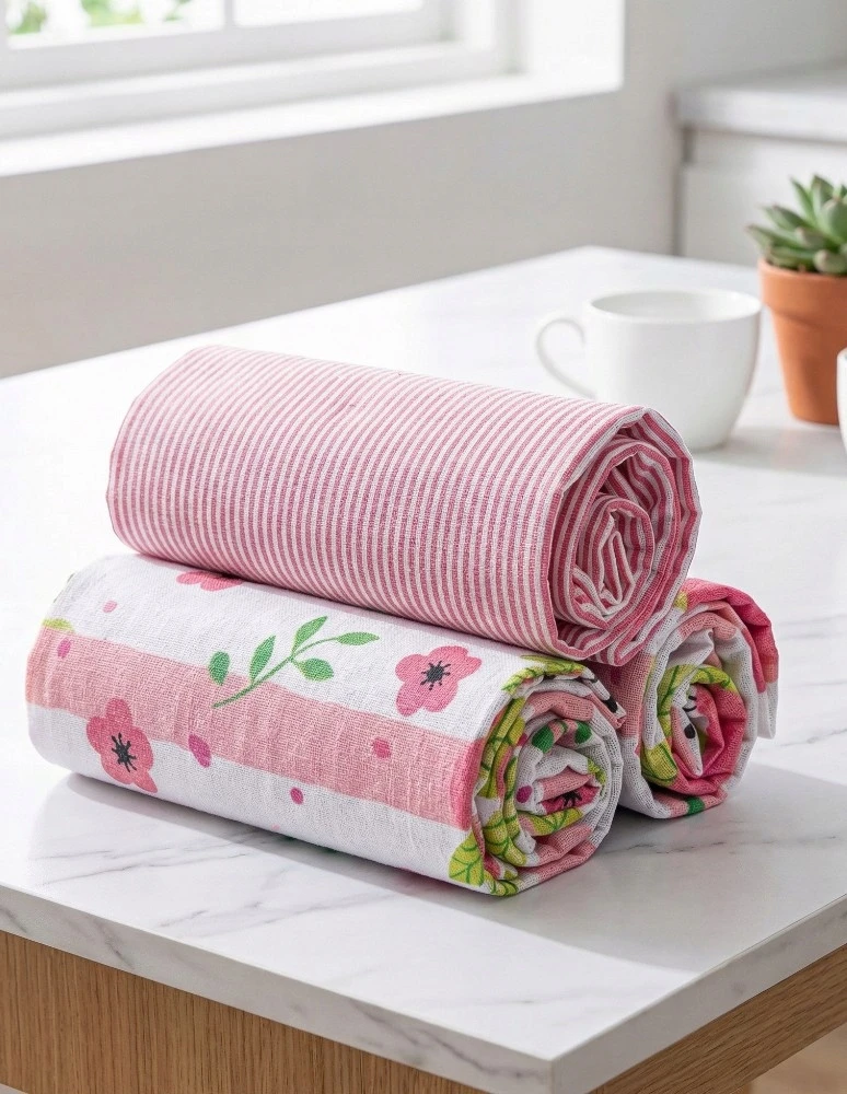 W zestawie znajdują się dwa ręczniki z dekoracyjnym kwiatem, które wprowadzą do kuchni świeżość i naturalny charakter, oraz jeden ręcznik w różowe paski nadającą mu nowoczesny wygląd.