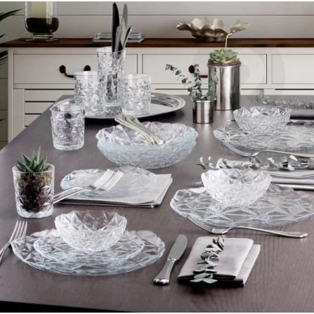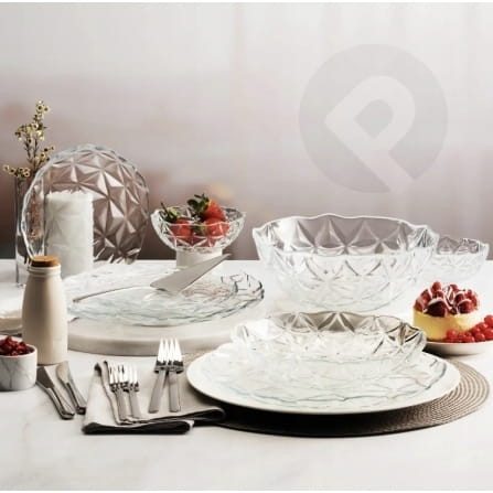Kolekcja Estrella wyróżnia się unikalnym, geometrycznym wzorem i nieregularnym rantem, co nadaje naczyniom wyjątkowy charakter. Przezroczyste szkło harmonijnie komponuje się z każdą aranżacją stołu, dodając jej elegancji i nowoczesności.