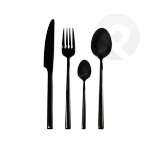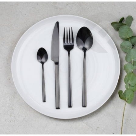 Zestaw sztućców Como Black składa się z 24 elementów z wąskimi i rzeźbionymi uchwytami. Dlatego doskonale komponują się zarówno z klasyczną, jak i nowoczesną zastawą stołową. Wykonany z wysokiej jakości stali nierdzewnej z ręcznie polerowanym lustrzanym wykończeniem. Zapakowane są w kolorowe pudełko upominkowe i stanowią doskonały pomysł na prezent. Każdy element zestawu można myć w zmywarce.