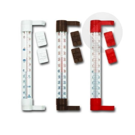 Termometr zewnętrzny zaokienny, przeznaczony zarówno do okien drewnianych, jak i plastikowych, łatwy w montażu za pomocą plastikowych płytek z taśmą klejącą, nie wymaga wiercenia.